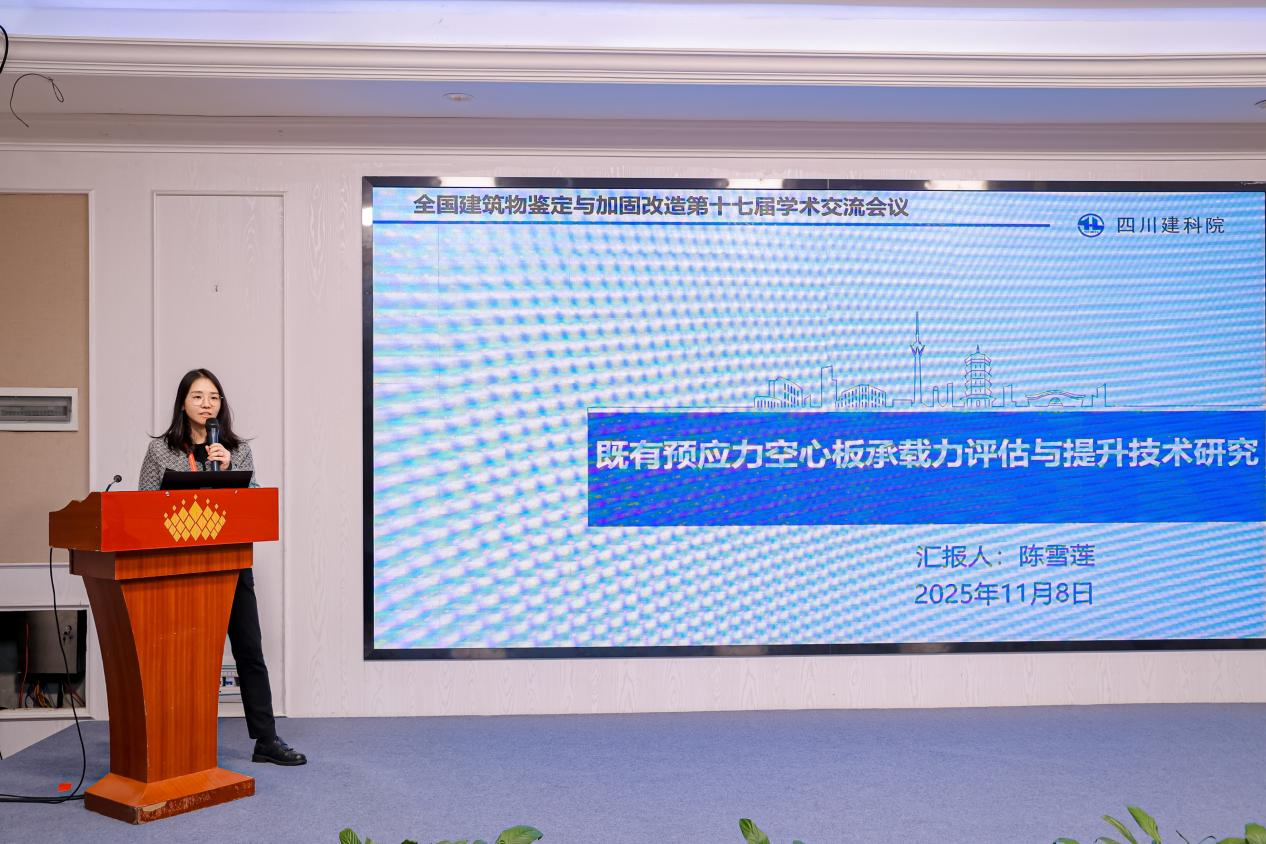 作为行业重要参与者,公司代表团全程深度参与大会各项核心议程,与全国各地的行业同仁围绕技术创新路径、工程实践难点、规范落地应用等关键话题,展开多维度、深层次的交流研讨,高效凝聚行业共识、对接优质资源。会上,公司总工程师陈雪莲作为受邀专家,发表题为《既有预应力空心板承载力评估与提升技术研究》的专题报告,凭借扎实的研究深度、鲜明的实践导向与创新的技术思路,引发广泛关注。该研究依托多组现场精准实测数据,首次系统厘清长役龄预应力空心板的预应力损失演化规律,科学验证了碳纤维布粘贴与增大截面法等加固技术的有效性。成果为城市更新场景下老旧建筑的结构安全评估、性能升级提供了关键数据支撑与科学依据,彰显了公司在既有建筑鉴定与加固改造领域的深厚技术积淀、前沿研发实力与领先的工程解决方案输出能力。
