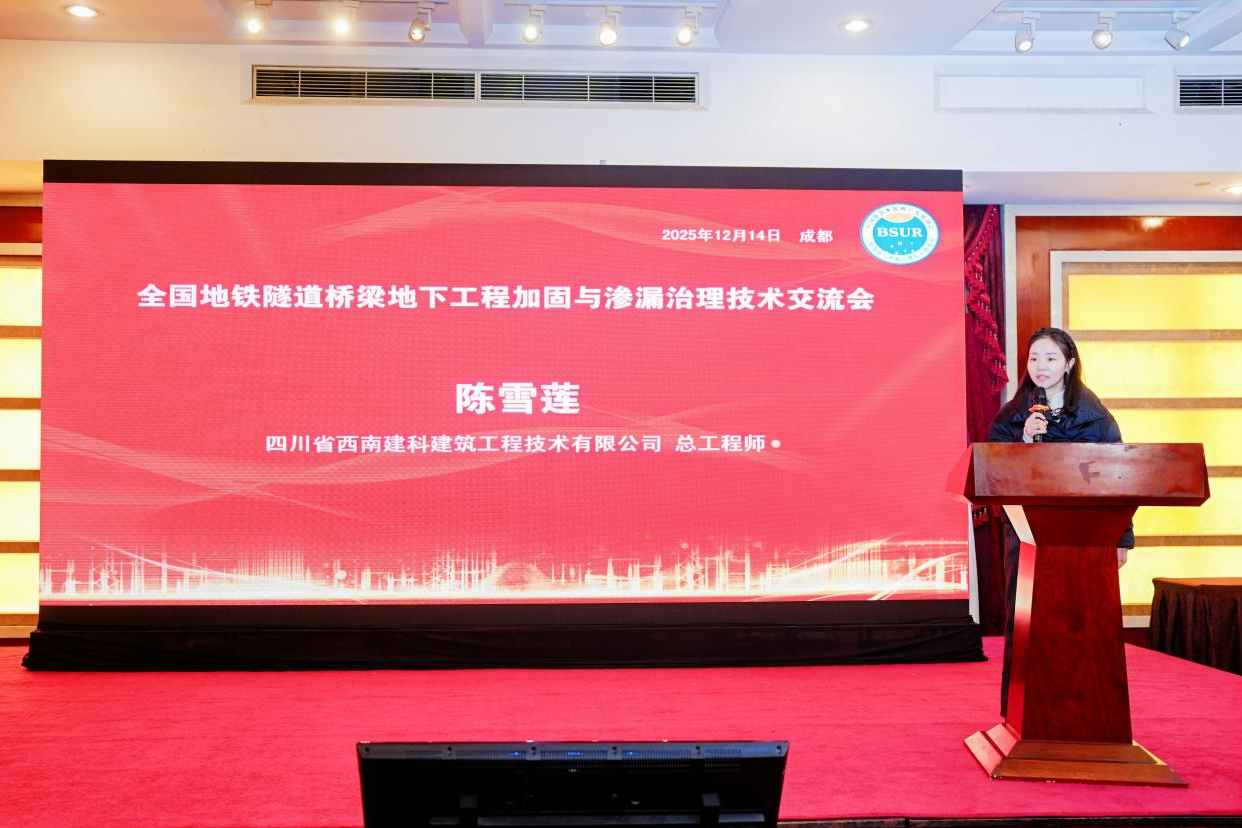 2025年12月13日至14日,一场聚焦地下工程领域核心技术难题的行业盛会在四川成都隆重召开。全国地铁隧道桥梁地下工程加固与渗漏治理技术交流会以“凝心聚力 蓄势待发”为主题,汇聚行业顶尖智慧,分享前沿实践经验,为破解工程加固与渗漏治理痛点、助力我国地下工程建设提质增效搭建了高效交流平台。四川省西南建科建筑工程技术有限公司(以下简称“建科公司”)作为主办单位之一深度参与,总工程师陈雪莲、战略合作单位负责人陈彦勇受邀作为行业技术代表登台发言,贡献专业见解。